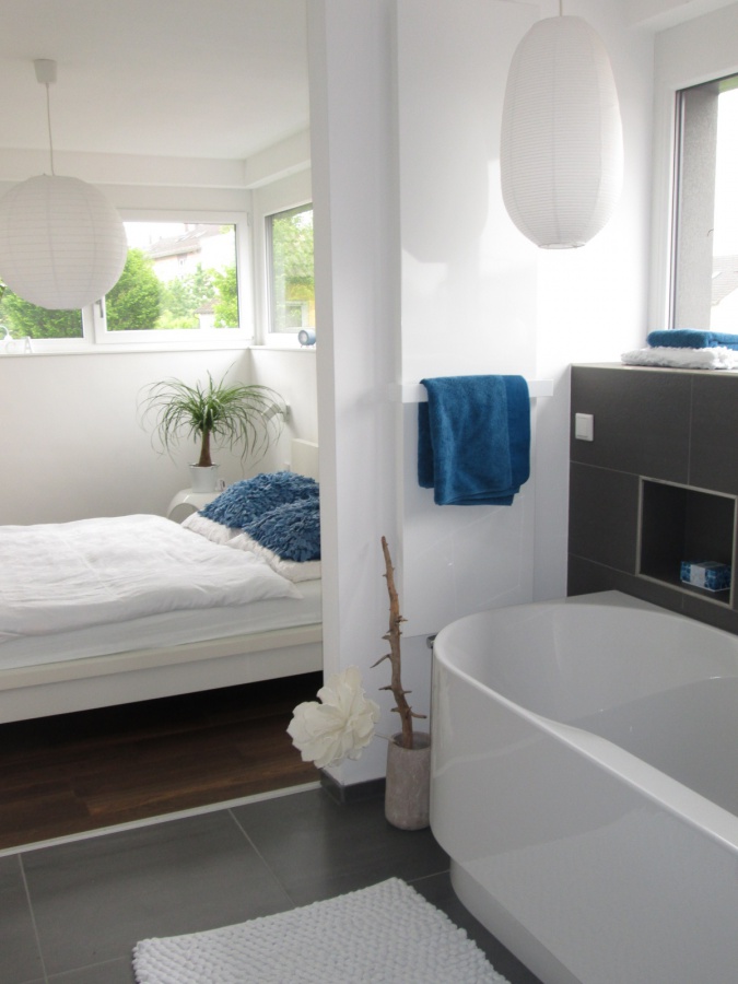 ... Hier mal unseren "Durchblick" vom Bad in unser Schlafzimmer....Ach übrigens "nein, es sind natürlich keine richtigen Badezimmerlampen, die über meiner geliebten Wanne hängen"... aber brauch man diese "typischen Badezimmerlampen" wirklich? Ich jedenfalls nicht, denn mit denen wäre es nie sooo gemütlich beim Baden, besonders, weil ich diese hier dimmen kann...