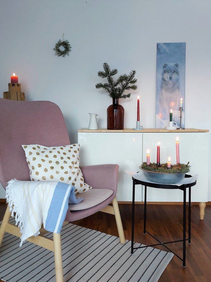 Eigentlich nur eine Notlösung - der Lehnstuhl wird vom Christbaum verdrängt und kommt im Wohnzimmer unter. Gefällt mir aber recht gut 😊.