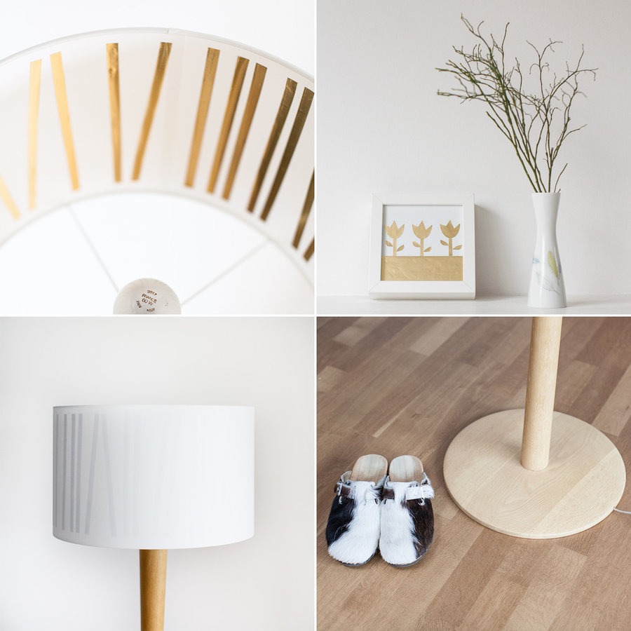 Ich hab mir unseren einfachen weißen Lampenschirm geschnappt und mit etwas Goldpapier aufgehübscht