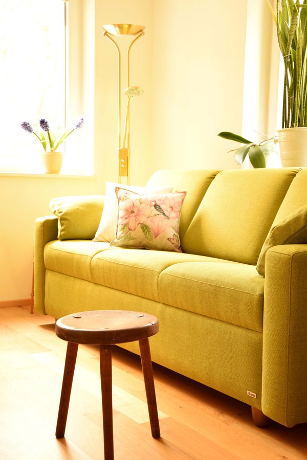 made in Austria, Sedda, XXXLutz, Sofa grün, Hocker Altholz, Hyazinthen, Pastell, Rosa, Frühling, Bogenhanf, Sansevieria, Wohnzimmer