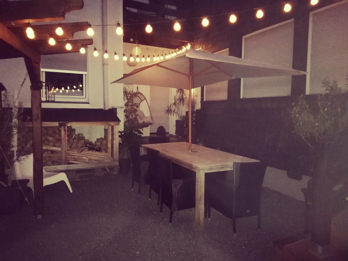 Altbau, Innenhof, Lichterkette, Urlaubsfeeling, Hängesessel, Olivenbaum, Garten, Hacienda