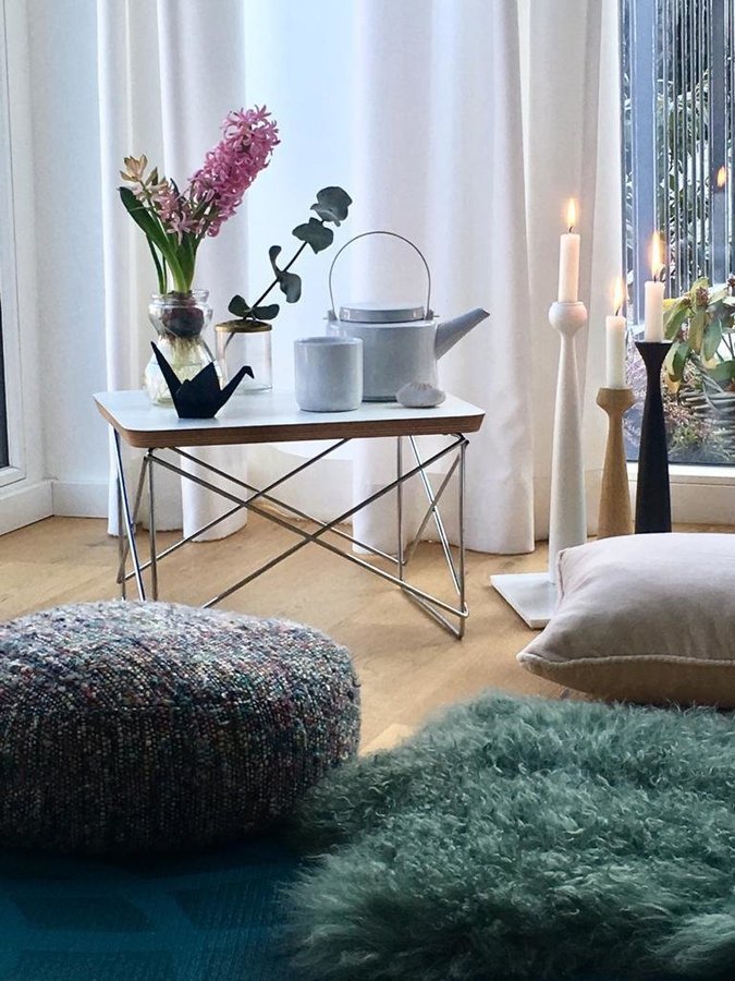 Yoga, Achtsamkeit, Gemütlichkeit, Wohnzimmer, Schaffell, Teekanne, Meditationskissen