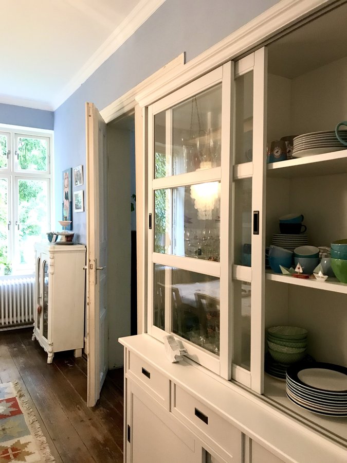 Esszimmer, Wandfarbe blau, Dielenboden