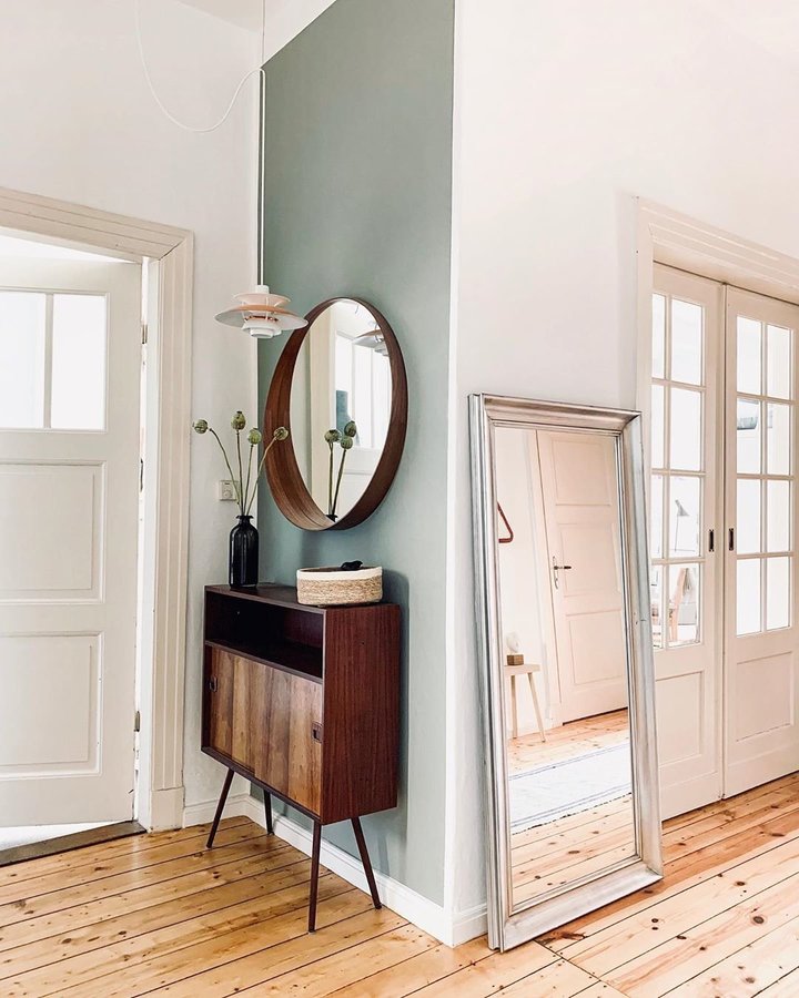 Flur, Altbau, Holzboden, Kommode, Vintage, Runder Spiegel, Wandfarbe grün