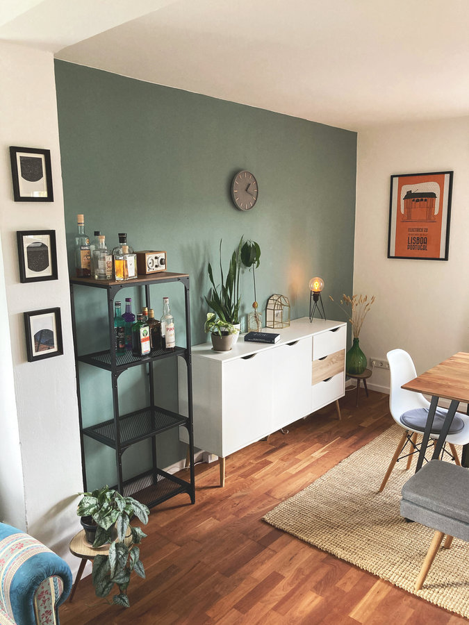 Japandi, Scandi, Boho, Pflanzen, Avocado, Bar, Holzboden, Esszimmer, Essbereich, Esszimmertisch, Esszimmerstuhl, Trockenblumen