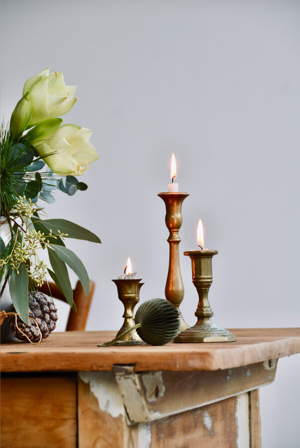 Advent, Altbauliebe, Altes Haus, Holztisch, Kerzenlicht, Kerzenständer, Amaryllis, Weihnachtsdekoration, Weihnachtszeit, Adventsdeko, Messing