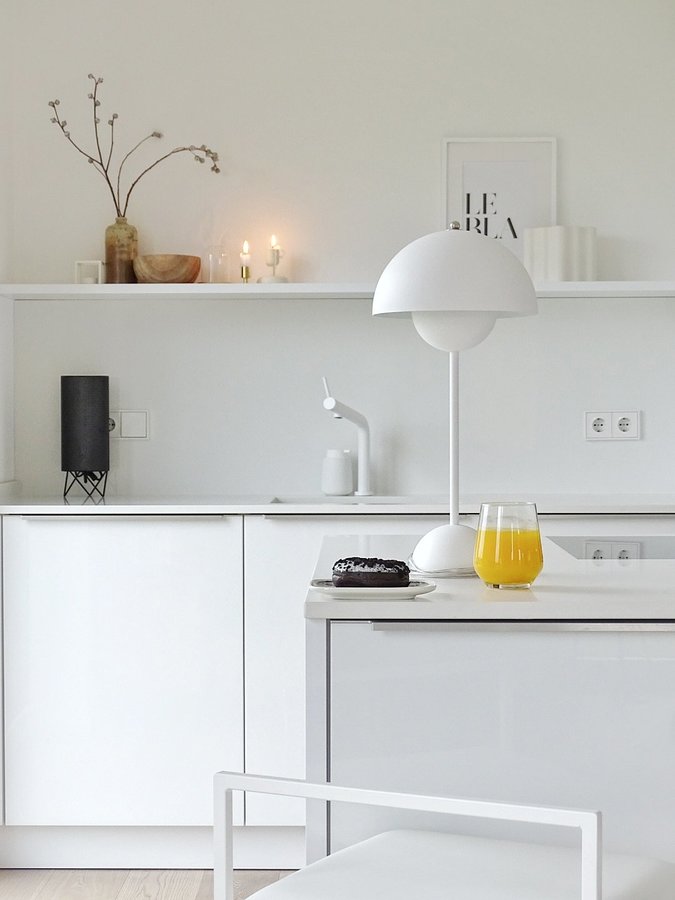 Weiße Küche, Tischlampe, Kücheninsel