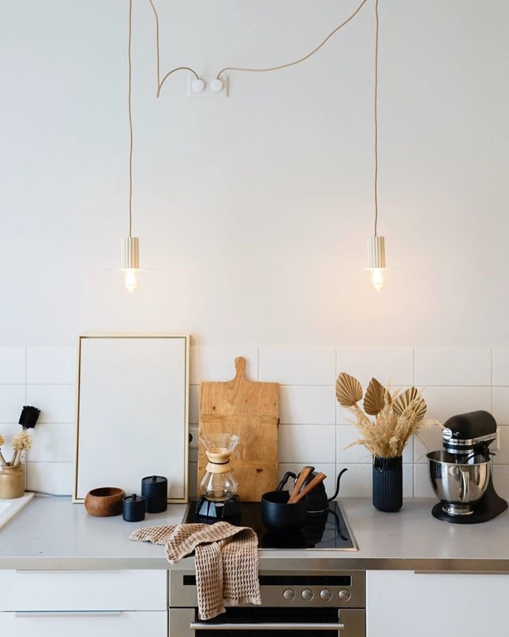 Küche, Arbeitsplatte, Küchenrückwand, Fliesenspiegel, Herd, Hängeleuchte, Weiß