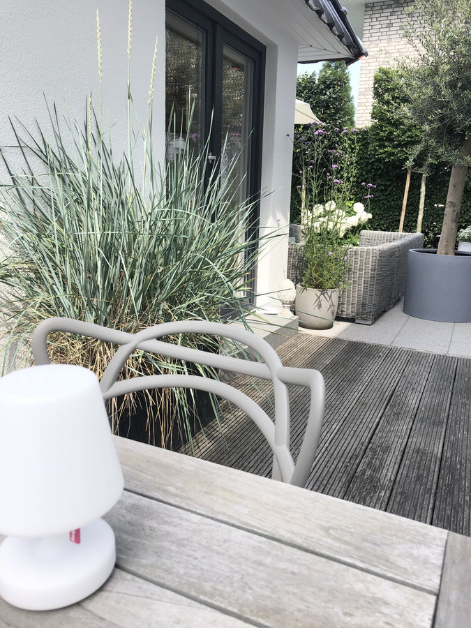 Sauna, Outdoorsauna, Terrassengestaltung, Terrasse, Bangkiraiterrasse, Strandhafer, Olivenbaum, Gartendeko, Eisenkraut