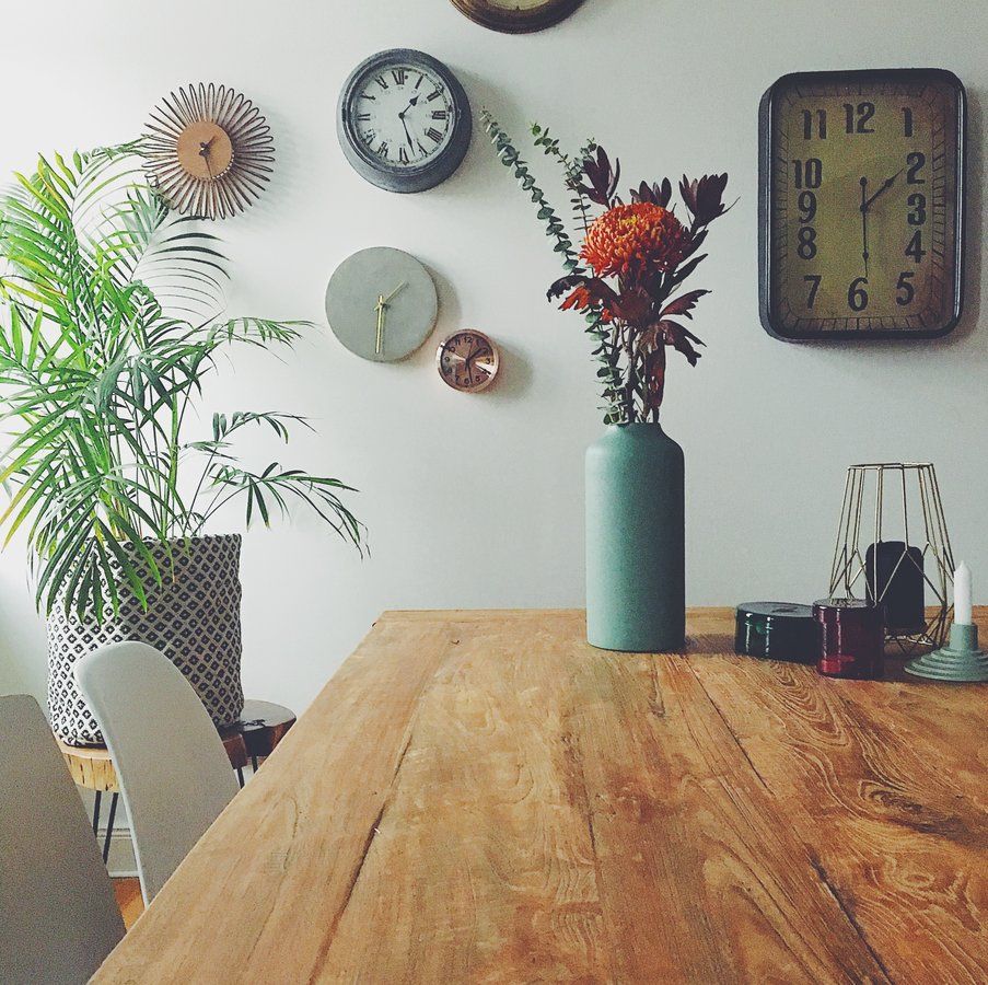 Blumen, Blumendeko, Esszimmer, Esszimmertisch, Wanduhr, Pflanzen