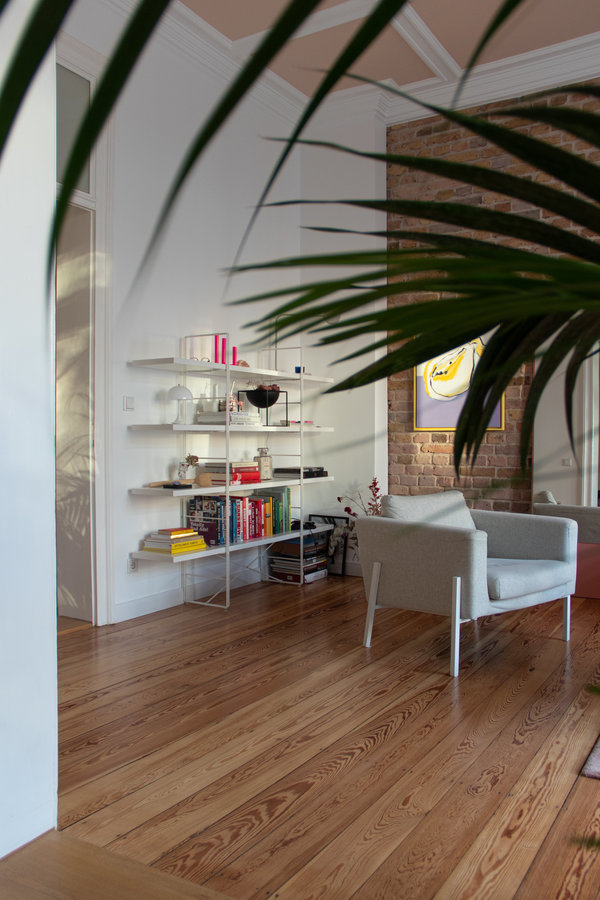 Sessel, Palme, Regal, Bücherregal, Deko, Dielen, Altbau, Stuck, Ziegelwand