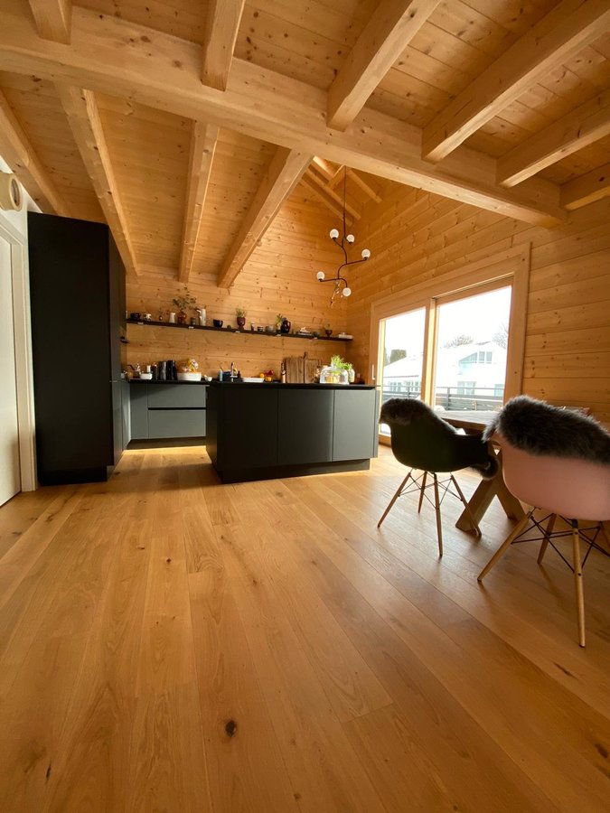 Essbereich mit Blick in die Küche. Das Haus ist aus Fichten und Lärchenholz, der Boden aus Eichendielen. Zuerst wollte ich alles aus einem Holz, dies ist aber nicht möglich und inzwischen gefällt mir auch der Mix sehr gut.