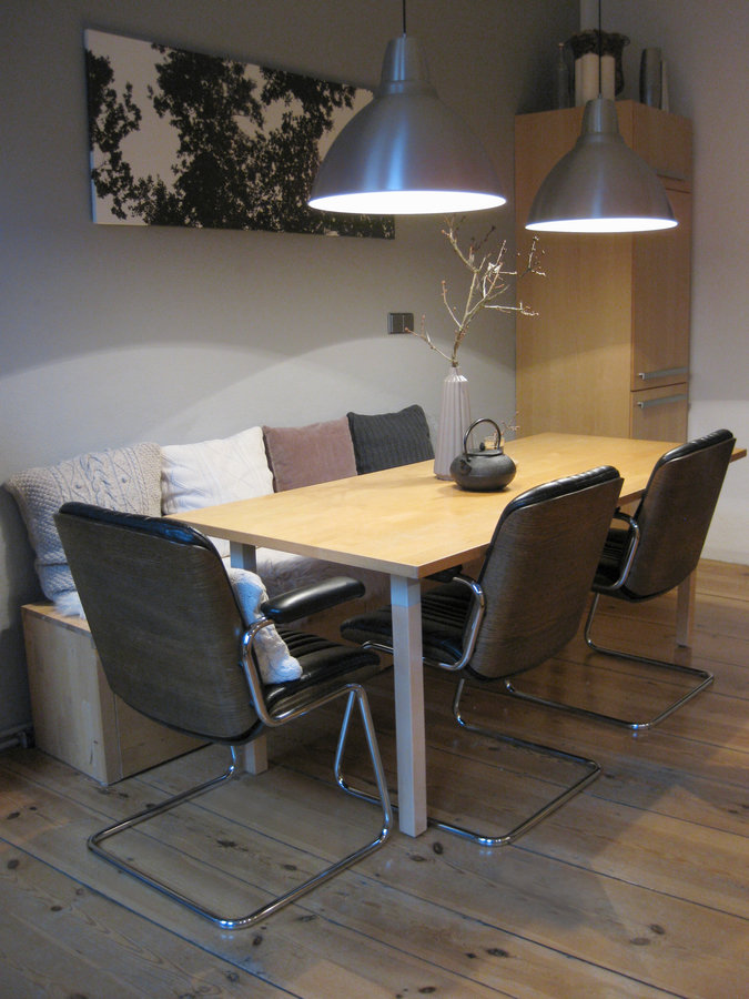 Die Lederfreischwinger sind aus den 60ern von Stoll Giroflex, der Tisch ist selbst zusammengeschustert (und soll bald weichen), die Banktruhen aus dem Norebo-System und die Leuchten "Foto" vom Schweden.