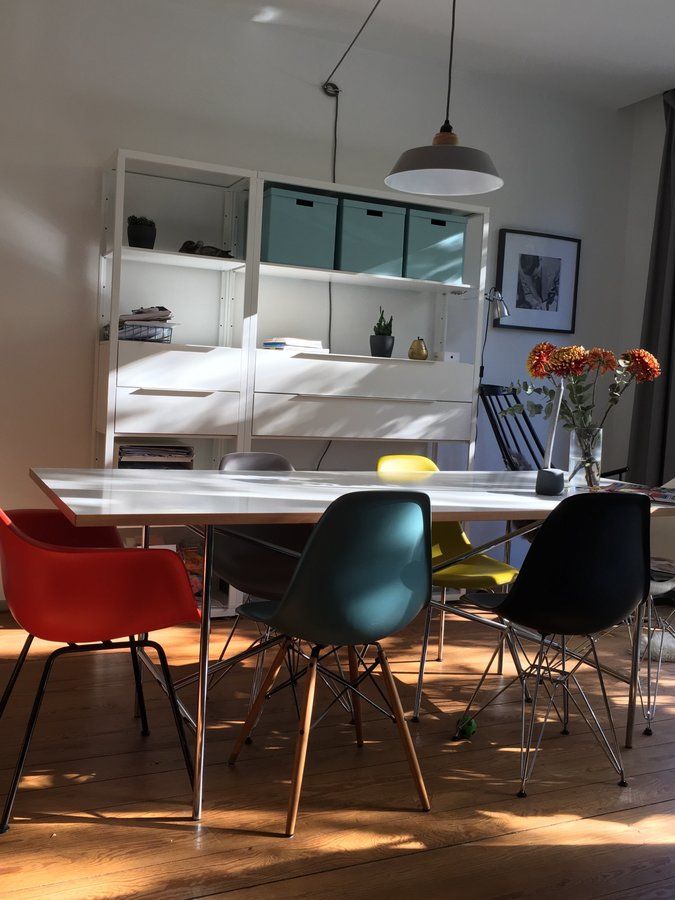 Esszimmer, Esszimmertisch, Eames Plastic Side Chair, DIY Lampe, Bunt