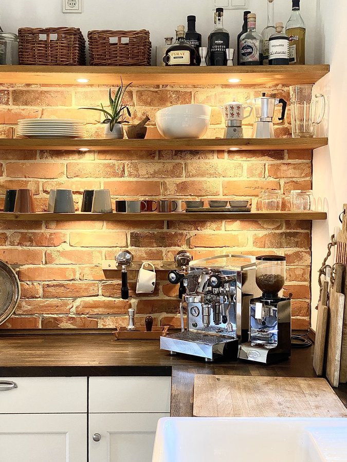 Backsteinwand, Klinkerwand, Wandregal, Küchenregal