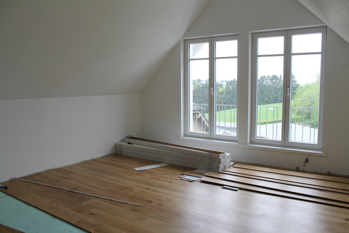 Schlafzimmer, Dachgeschoss, Parkett, weiße Fenster