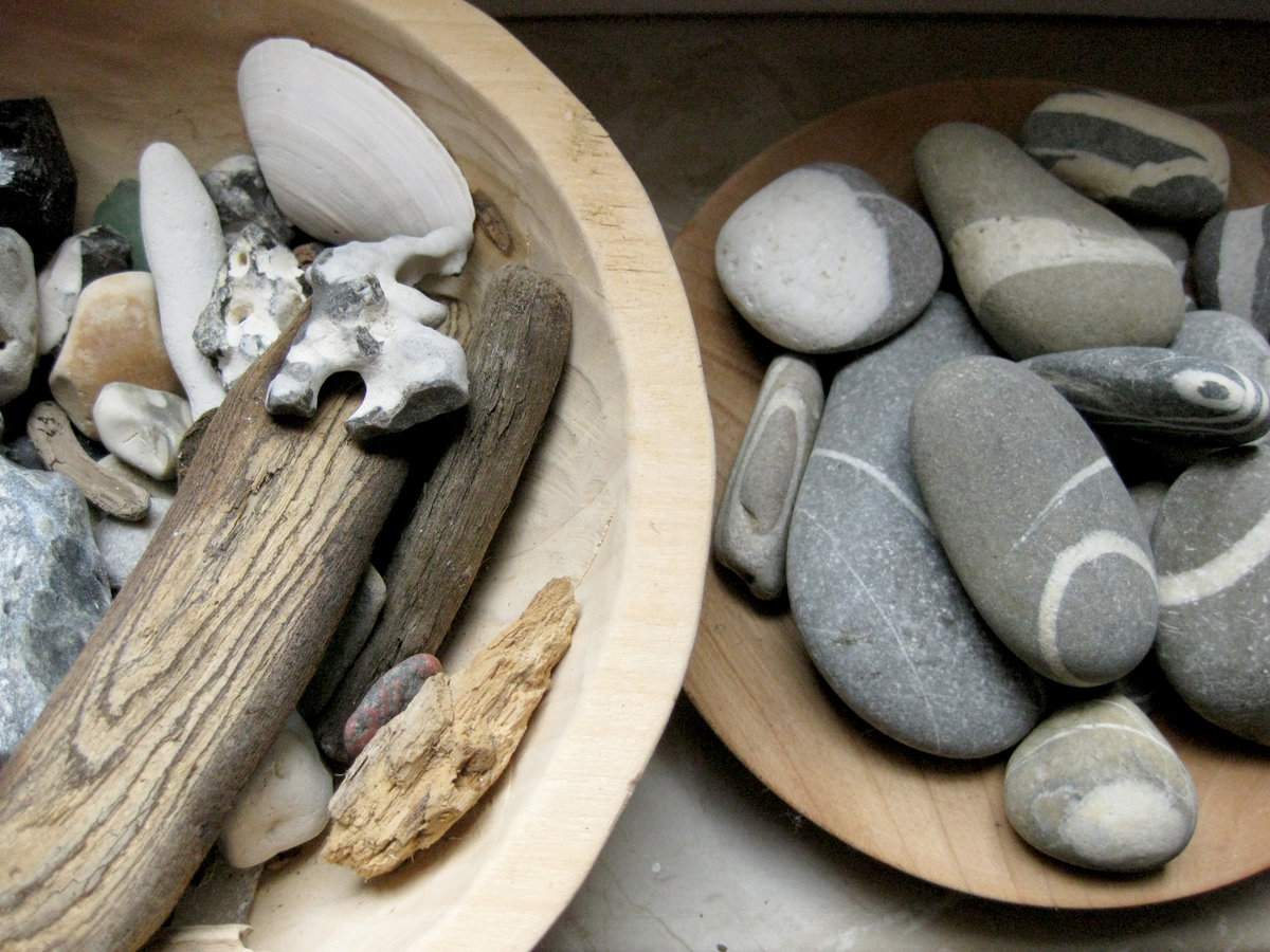 ... im Esszimmer. Rollholz, Seeglas, Muscheln, Lechkiesel in Holzschalen.
