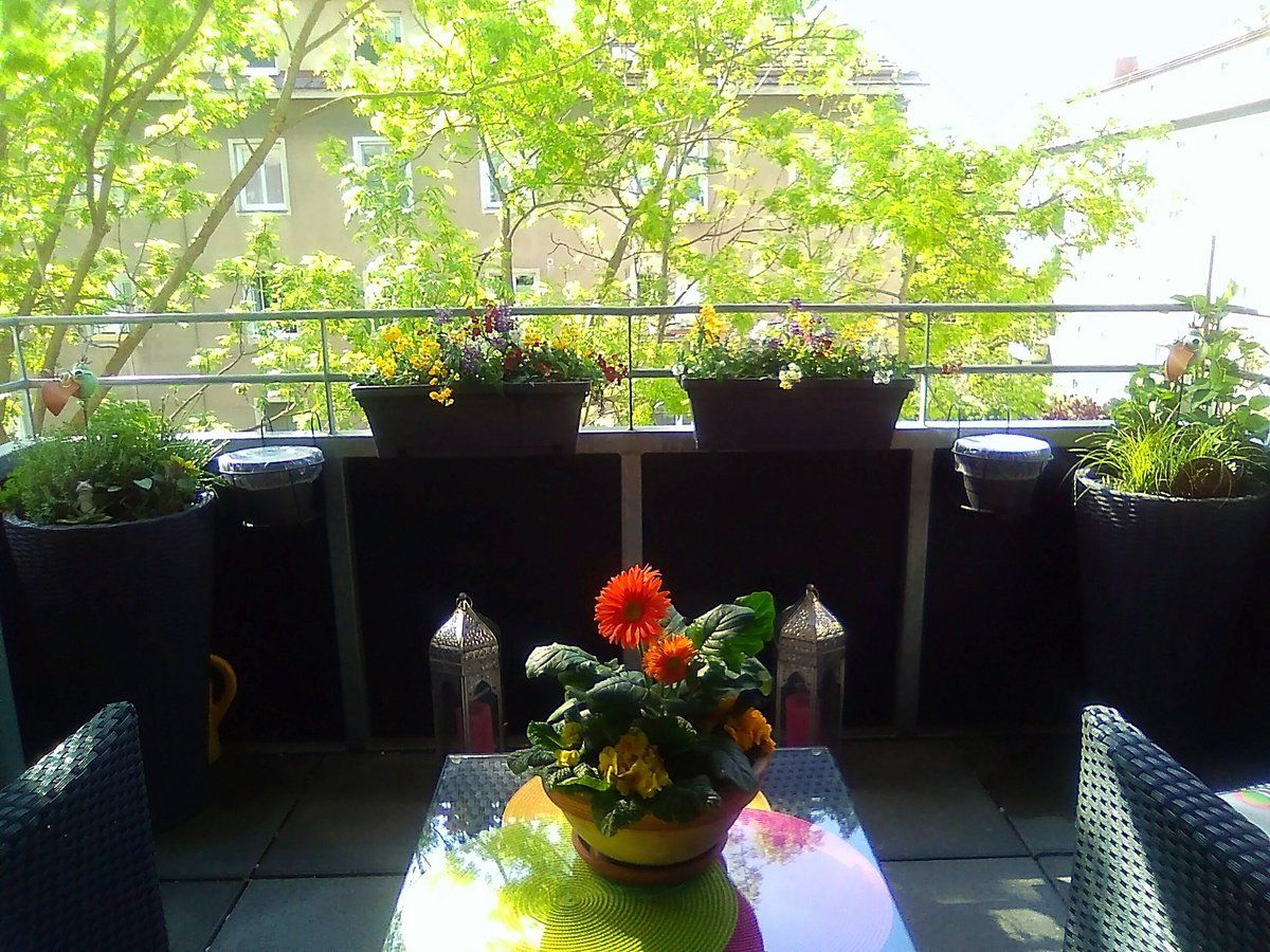 Fertige Balkonbepflanzung mit Blumen und Kräuter.