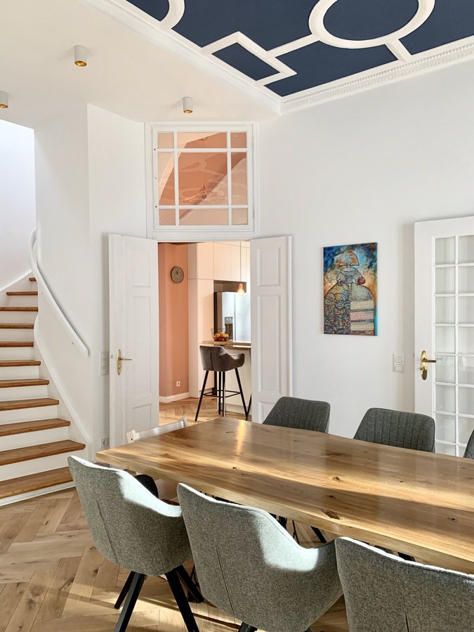 Ess und Wohnbereich, Esszimmer, Esstisch, Stuhl, Küche, Treppe, Stuck, Altbau, Altbauliebe, Alt und neu