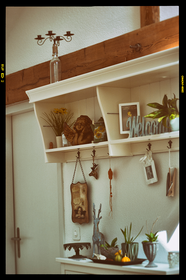 In unserer grossen Wohnung haben wir nicht wirklich einen Flur. Man betritt die Wohnung und ist direkt im Wohnbereich. Um die notwendigen Dinge wie Schuhe zu verstauen, haben wir den hinteren Wohnbereich mit den Zugängen zu Büro, Bad und Schlafzimmer zu unser Stauraumecke gemacht. Im LIATORP Wandregal dekoriere ich öfter um und darunter (kaum sichtbar auf dem Bild) ist nun der Schuhschrank der HEMNES Serie von IKEA. Gut zu erkennen sind die Sichtbalken die bis in den Spitz gehen.