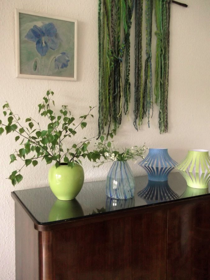 Antiker Schrank, Wandbehang, Grün, Blau, Birkenzweige, Sternmiere, DIY Laternen, Zeichnung Blaumohn