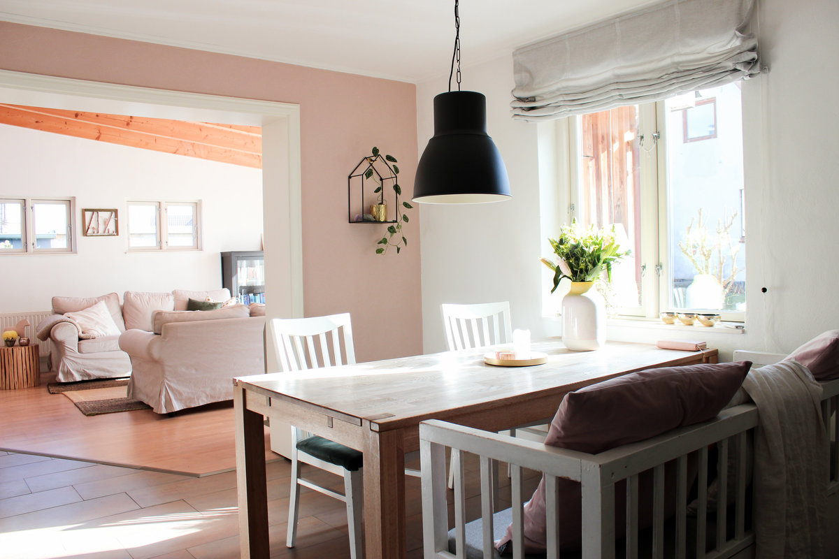 Sonnenlicht, Vase, Blumen, Esszimmer, Wohnzimmer, skandinavisch Wohnen, Wandfarbe Rosa