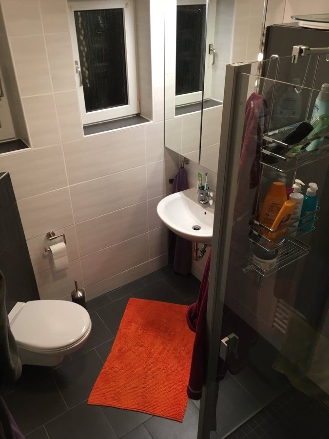 Der Hammer sind aber die Regendusche Grohe Euphoria und unser riesiger Spiegelschrank von Ikea. Der Teppich ist der einzige Farbtupfer, da organge meine Lieblingsfarbe ist.