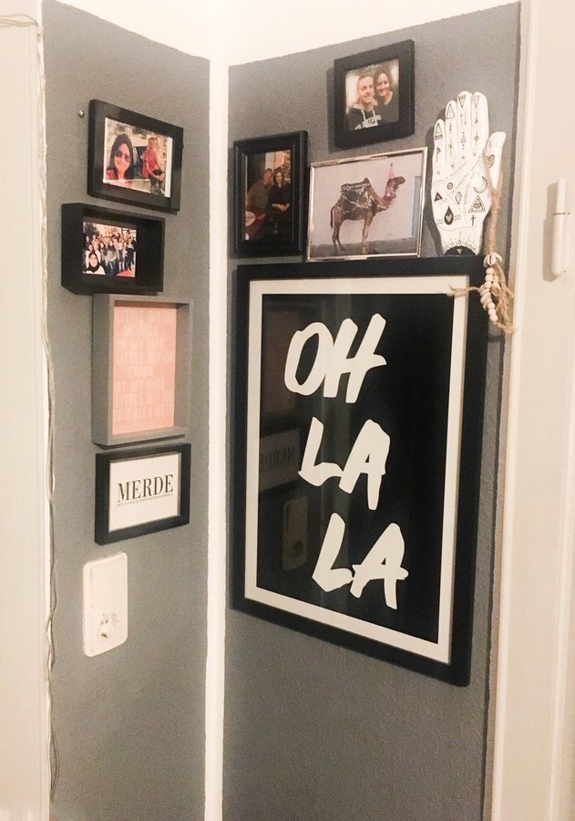 Gegenüber meiner Fensterfront (siehe vorheriges Bild) kommt mehr Farbe ins Spiel in Form der Fotos.Ob Familienfotos oder meiner französischen Ader entsprechende Drucke oder die toll aus Australien importierte Hand mit Beschriftung-dank des grauen Hintergrunds und der überwiegend schwarzen Bilderrahmen wirkt die Ecke nicht unruhig.