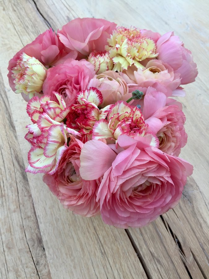 ...helfen Blumen. So prachtvoll schöne wie diese. Früher konnte ich Nelken überhaupt nicht leiden, Propagandablumen und so, aber heute? Es gibt so viele tolle Farbstellungen, genau wie bei diesen Ranunkeln. Habe sie zuvor noch nie in blaß flamingofarbene (wirken auf dem Bild eher pink) gesehen...