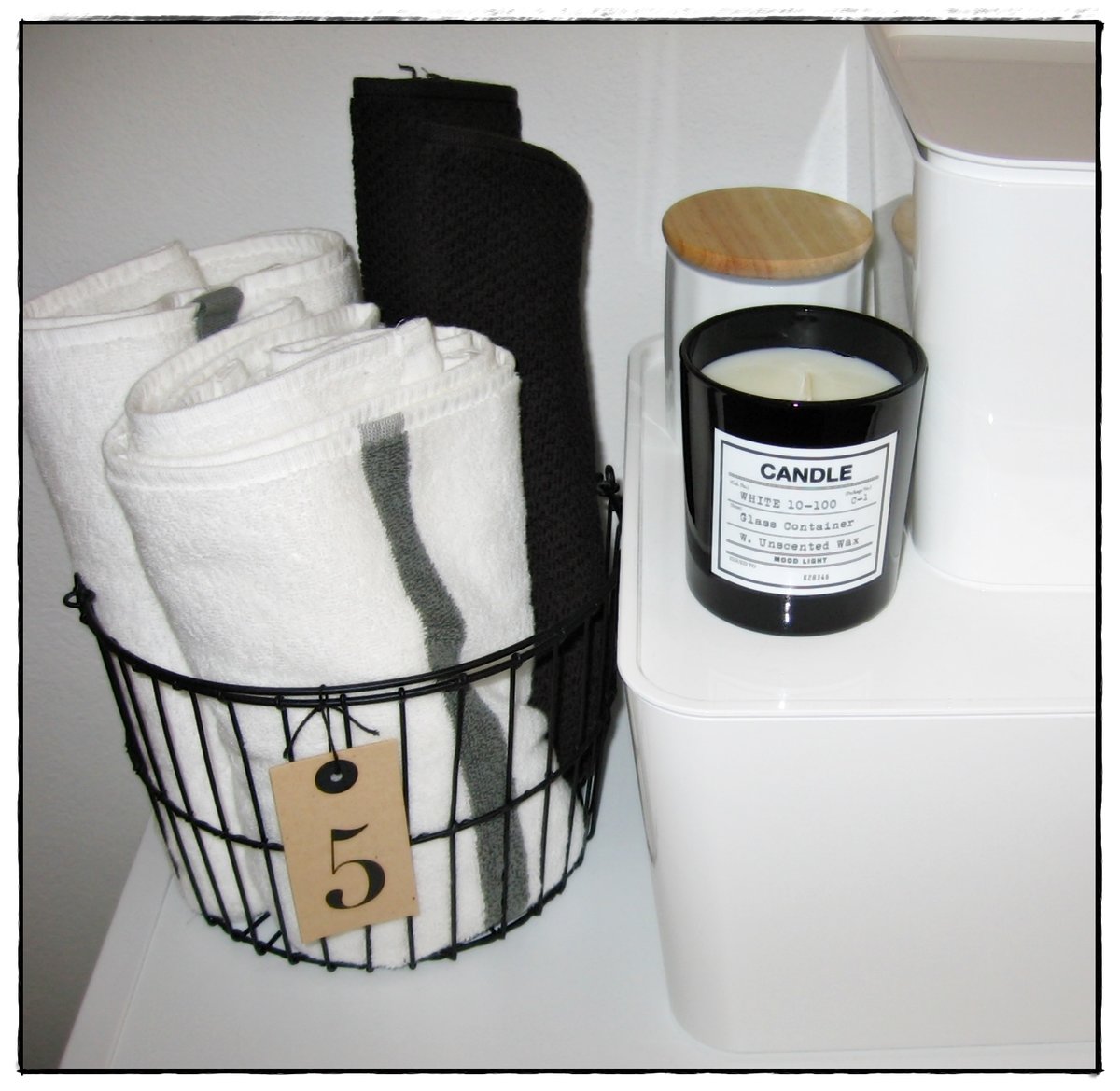 Candle, Kerze im Glas, schwarz weiß, Deko, Badezimmer, Ablage, Pluggis Boxen, Aufbewahrungsbehälter, Gästetücher