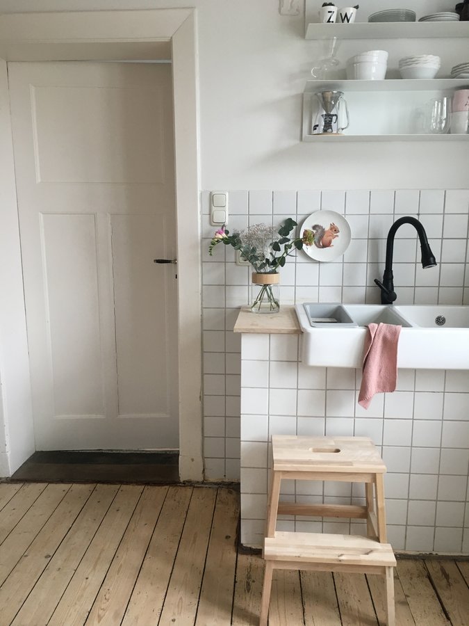 Gerade eben habe ich den neuen Artikel hier auf Solebich über Spritzschutz-Möglichkeiten in der Küche gelesen und gedacht, dazu poste ich auch mal ein Bild, wie wir es gelöst haben. Wir haben unser Altbau-Häuschen ja erst vor kurzem gekauft und haben uns erstmal mit den weißen quadratischen Fliesen arrangiert. Es standen einfach wichtigere Projekte auf der To-do-Liste und ich mag die Ecke trotzdem ganz gerne. Auf der anderen Seite ist die Küchenzeile und dort haben wir mit Latexfarbe gearbeitet. Aber den Blick dort hin zeige ich gern auch noch mal.