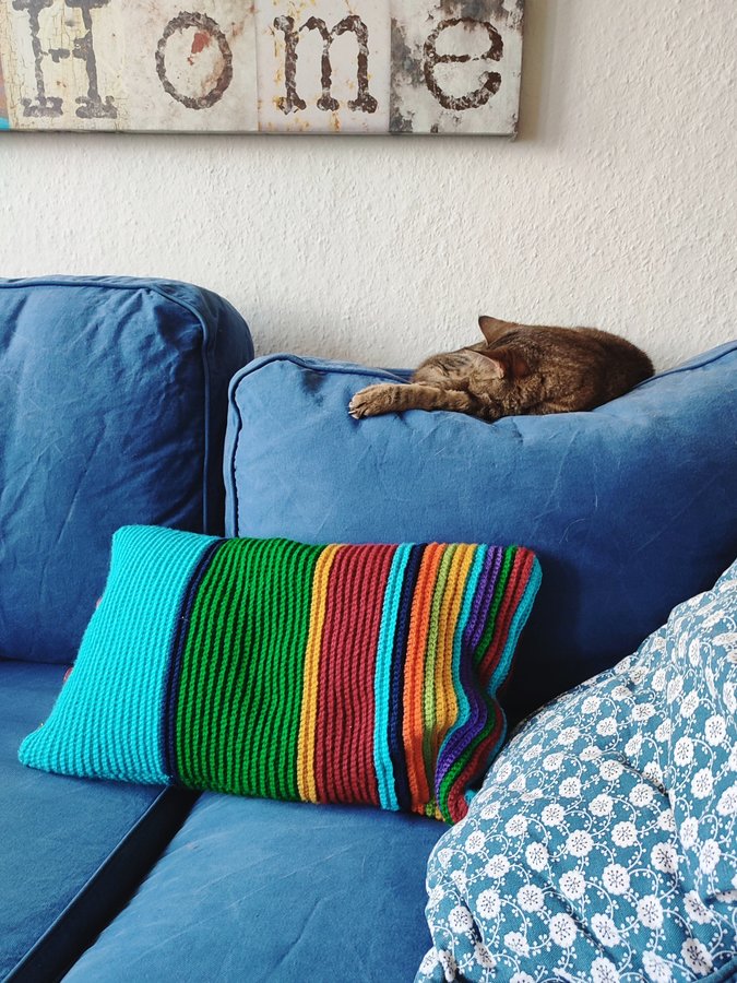Gestern war bei uns Stadtteilfest. Und dieses wunderschöne handgemachte Kissen wollte unbedingt mit zu mir nach Hause 😉💙🩵♥️💚💛❤️🧡