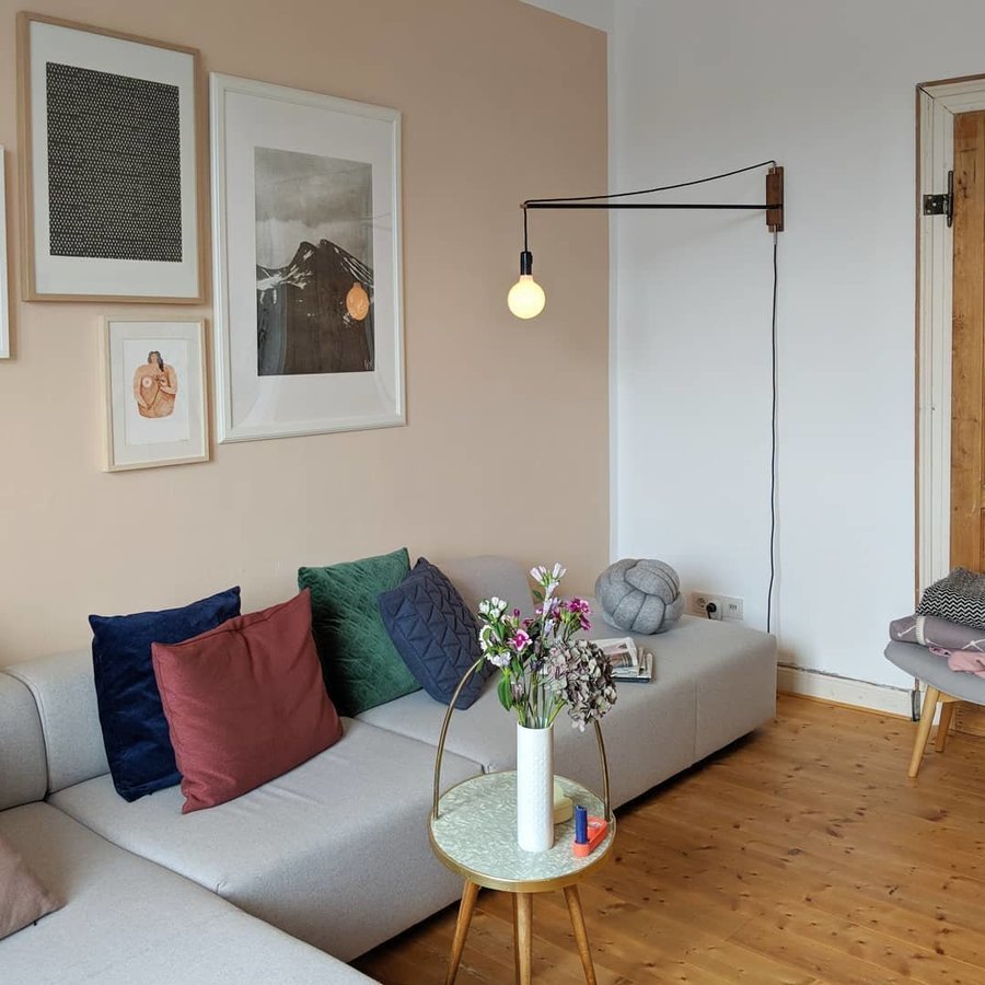 Wandleuchte, Wandgestaltung, Wandfarbe Beige, Sofa, Beistelltisch, Wohnzimmer