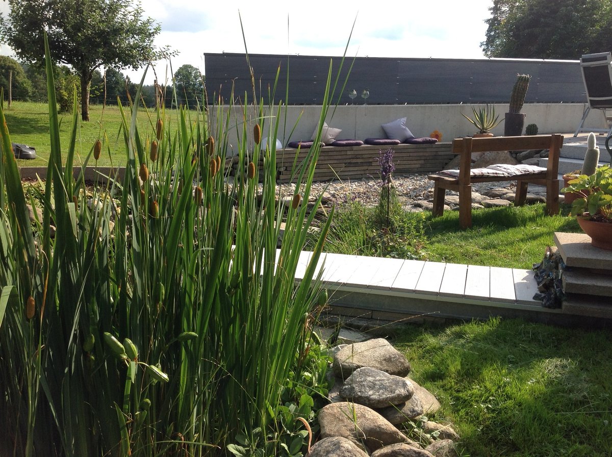 Gleich gibt es einen Sundowner am Teich und für die Fische Futter.