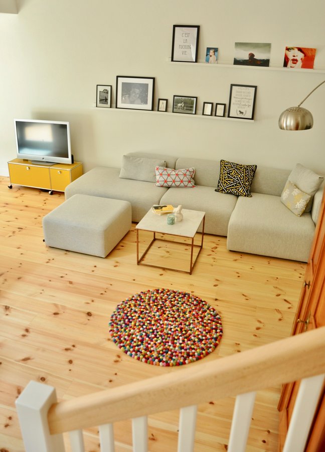 Unser goldgelbes USM Haller TV-Sideboard bringt den Raum zum Strahlen ☺️ Und sonnige Farben kann ich gerade sehr gut um mich gebrauchen bei dem Schietwetter draußen! Das Gelb habe ich mit dem HAY Kissen wieder aufgegriffen und auch in unserem quirligen Pinocchio Teppich findet sich ein Wenig Gelb wieder.