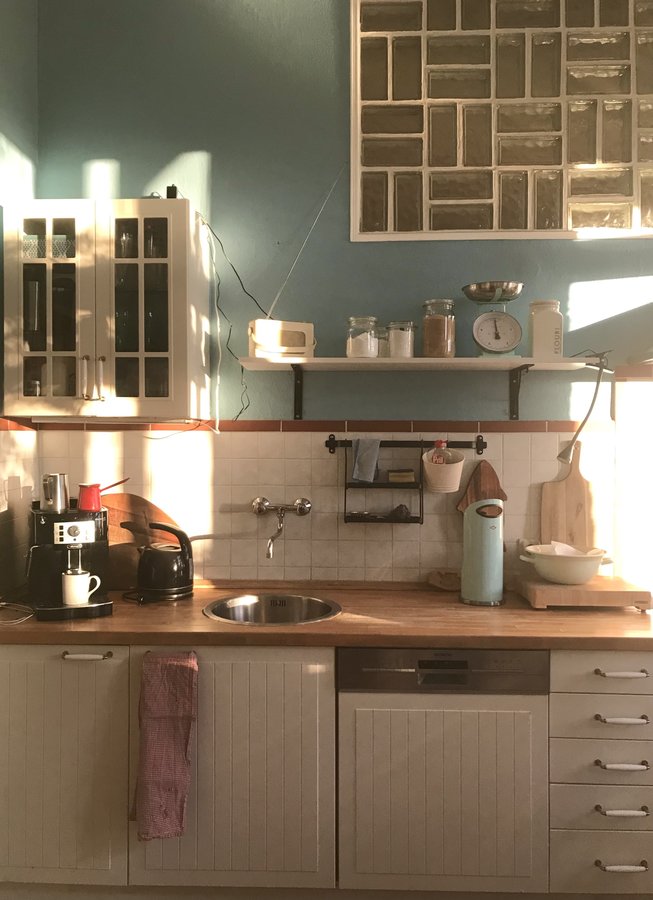 Küche, Wintersonne, Wandfarbe blau