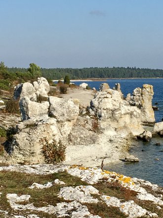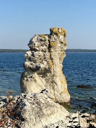 Gotland eine wunderbare Inselwelt. Hier auf dem Bild befinde ich mich auf Fårö hinter mir eine sehr bekannte Rauke. Diese Steingebilde sind von ganz allein gewachsen und mit etwas Phantasie kann man ganz viele Gesichter in den Gesteinsformationen erkannten oder auch Tiere.