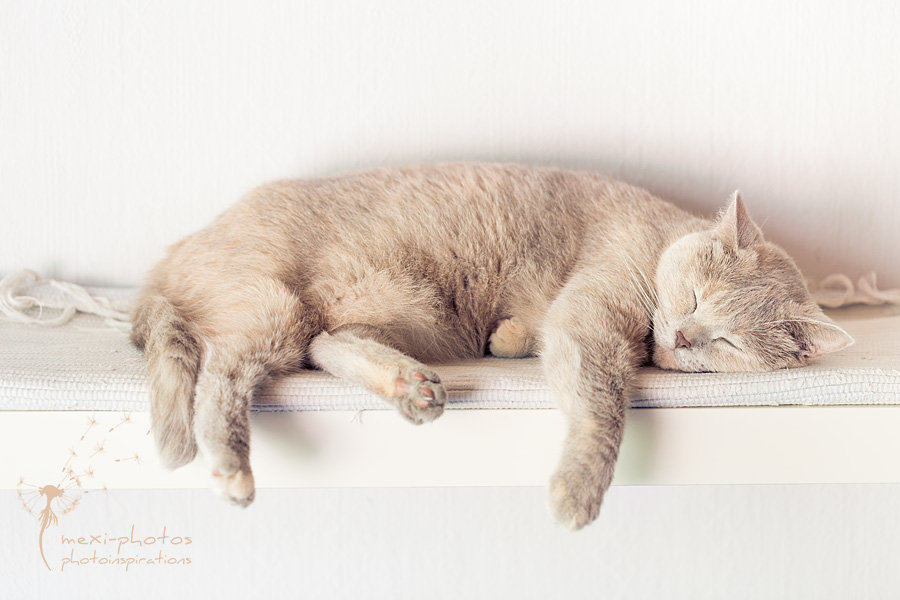 So haben wir einfach ein langes "Lack"-Regal von Ikea an die Wand gemacht und dieses mit einem weichen Teppich belegt. Wie man sehen kann liebt Grace es darauf zu liegen. Wenn sie wach ist kann sie von der erhöhten Position aus dem Fenster schauen oder das Leben im Wohnzimmer aus sicherer Höhe betrachten.