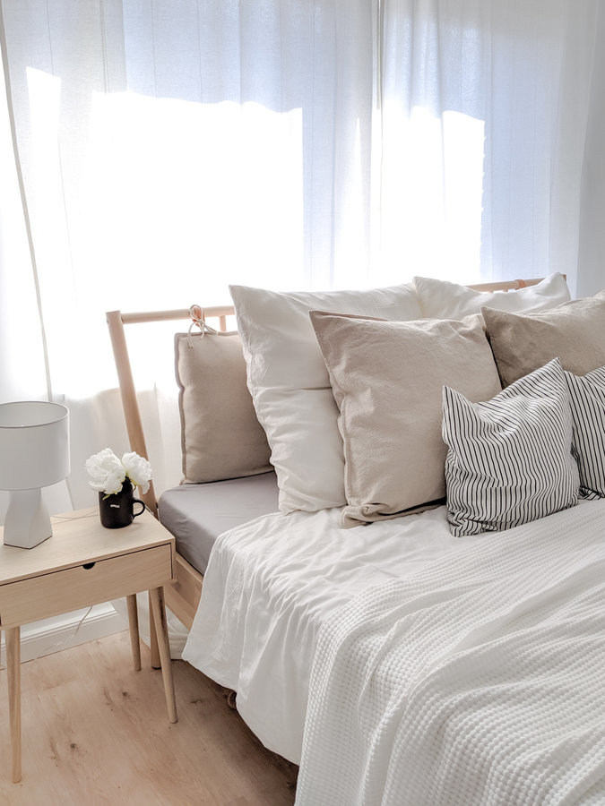 Schlafzimmer, Kissen, Bettwäsche, Vorhänge, Ikea, Björksnäs, Holz