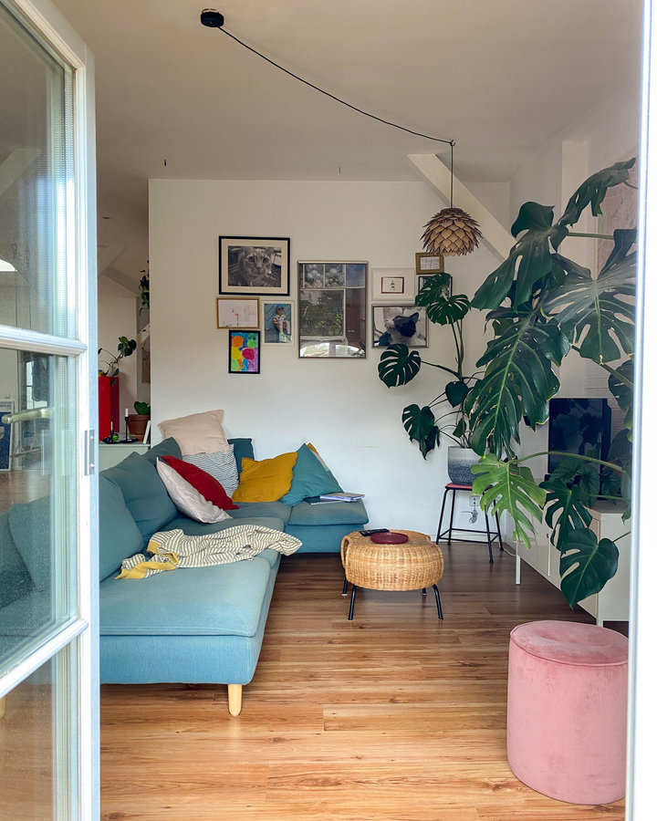 Wohnzimer, Dachgeschoss, Sofaecke, Farben, Pflanzen, Hocker, Bilderwand