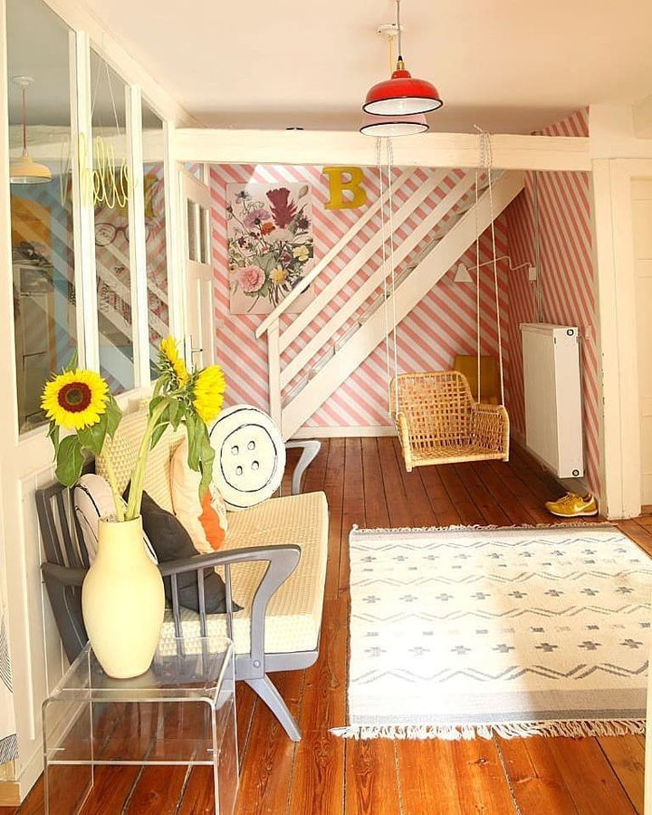 Flur, Teppich, Sonnenblumen, Treppe, Hängestuhl, Hängesessel, Rattan
