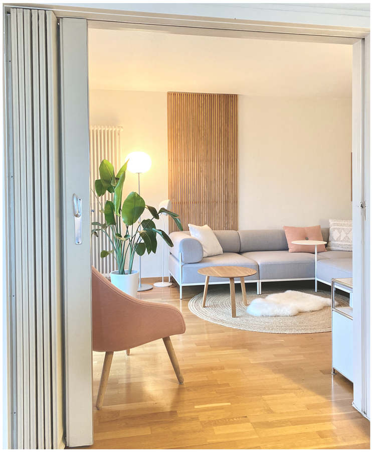 Wohnzimmer, Wandgestaltung, Diy, Lamellenwand, Sofa, Teppich, Sessel, Beistelltisch, Stehlampe, Kissen, Strelitzie