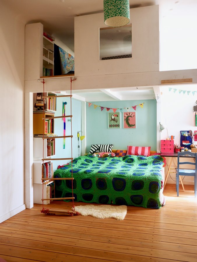 Kinderzimmer, Hochbett, Häkeldecke, Granny Squares, Kinderbücher