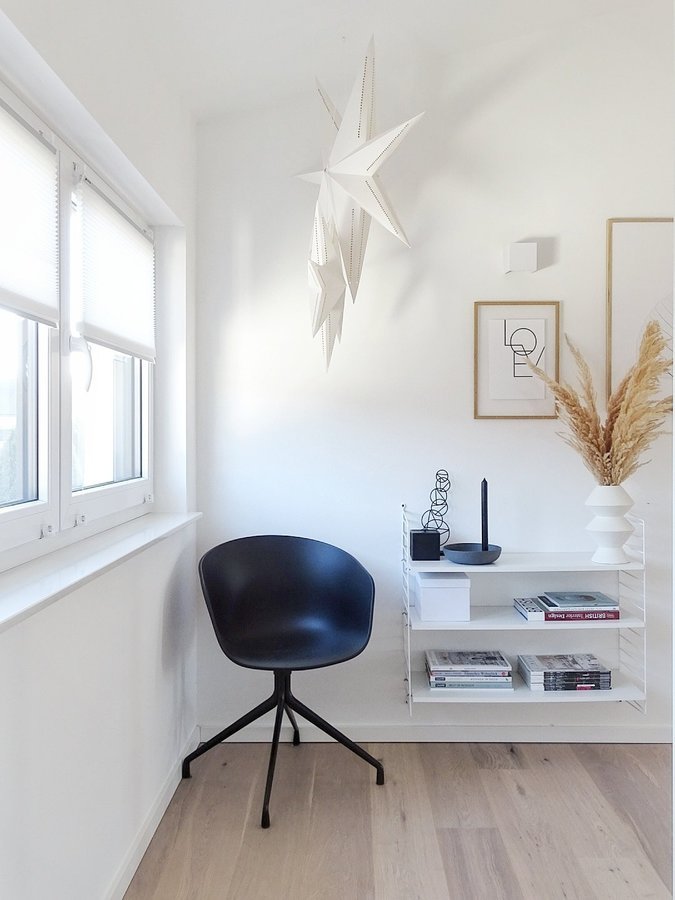 Flur, Leseecke, Holzboden, Neubau, Schwarzer Stuhl, Wandregal