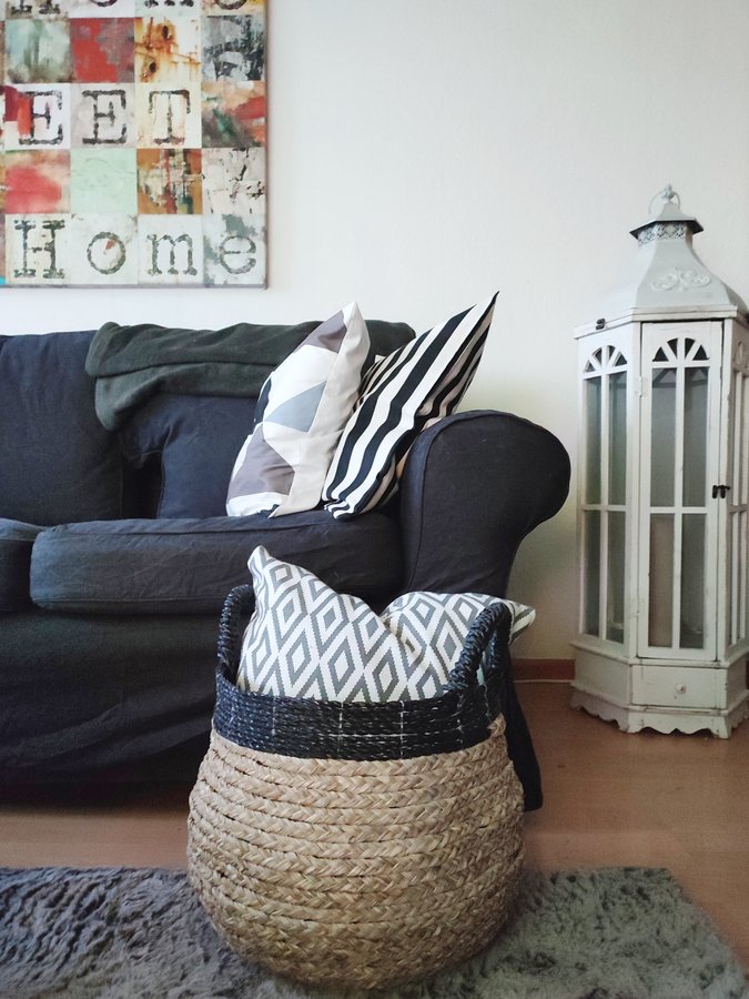 Wohnzimmer aktuell, Sofa, Couch, umgezogen, Schwarz, laterne, Weiß, Korb, Kissen