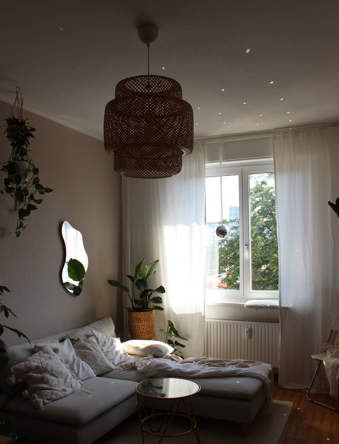 Wohnzimmer, Wohnzimmerdeko, Couch, Couchtisch, Sofa, Sofaecke, Lampe, Lampenschirm, Vorhang, Vorhänge, Kissen, Spiegel, Pflanze, Pflanzen, Plaid