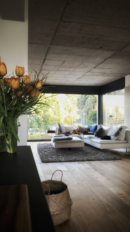 Eichenparkett, Sichtbeton, Frühling 2016, Fenster bodentief, Bungalow, Wohnzimmer