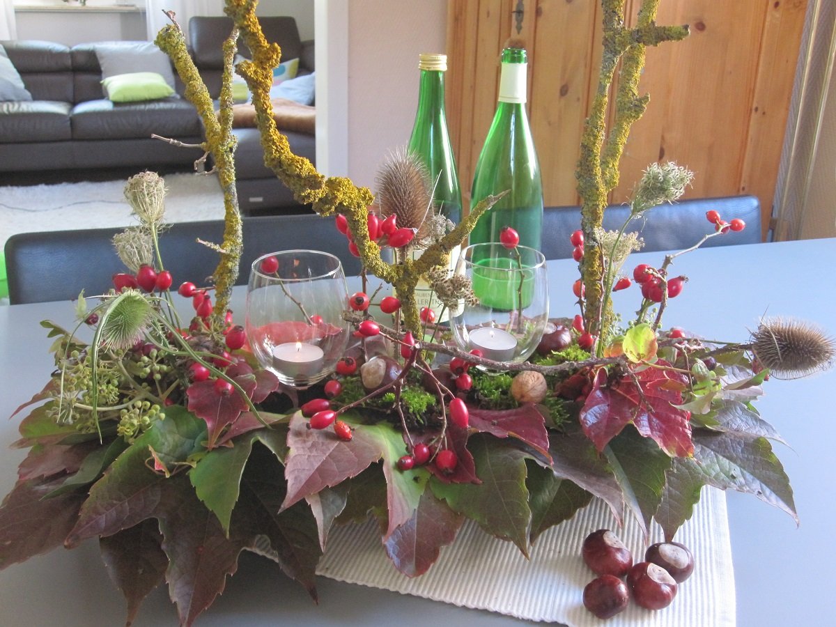Weinlaub, Flechten, Deko, Tischgesteck, Teelichter, Tischdeko, Weinflaschen, Esszimmer, Gesteck, Laub, Wallnüsse