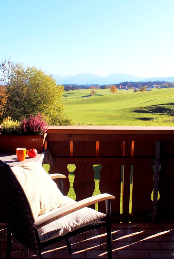 Herbst, Balkon, Wiesen, Berge, Ausblick, Gartenmöbel, Stuhl, Kissen, Tasse, Apfel