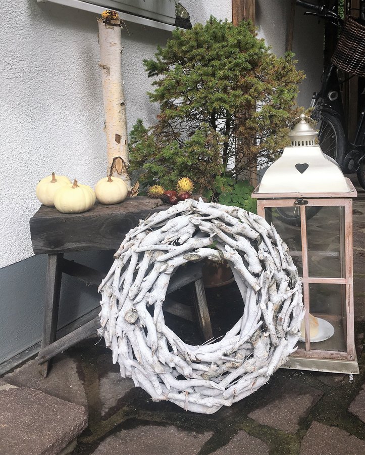 Herbst, Herbstdeko, Kranz, Windlicht, laterne, Hauseingang, Kürbisse, alter Schemel